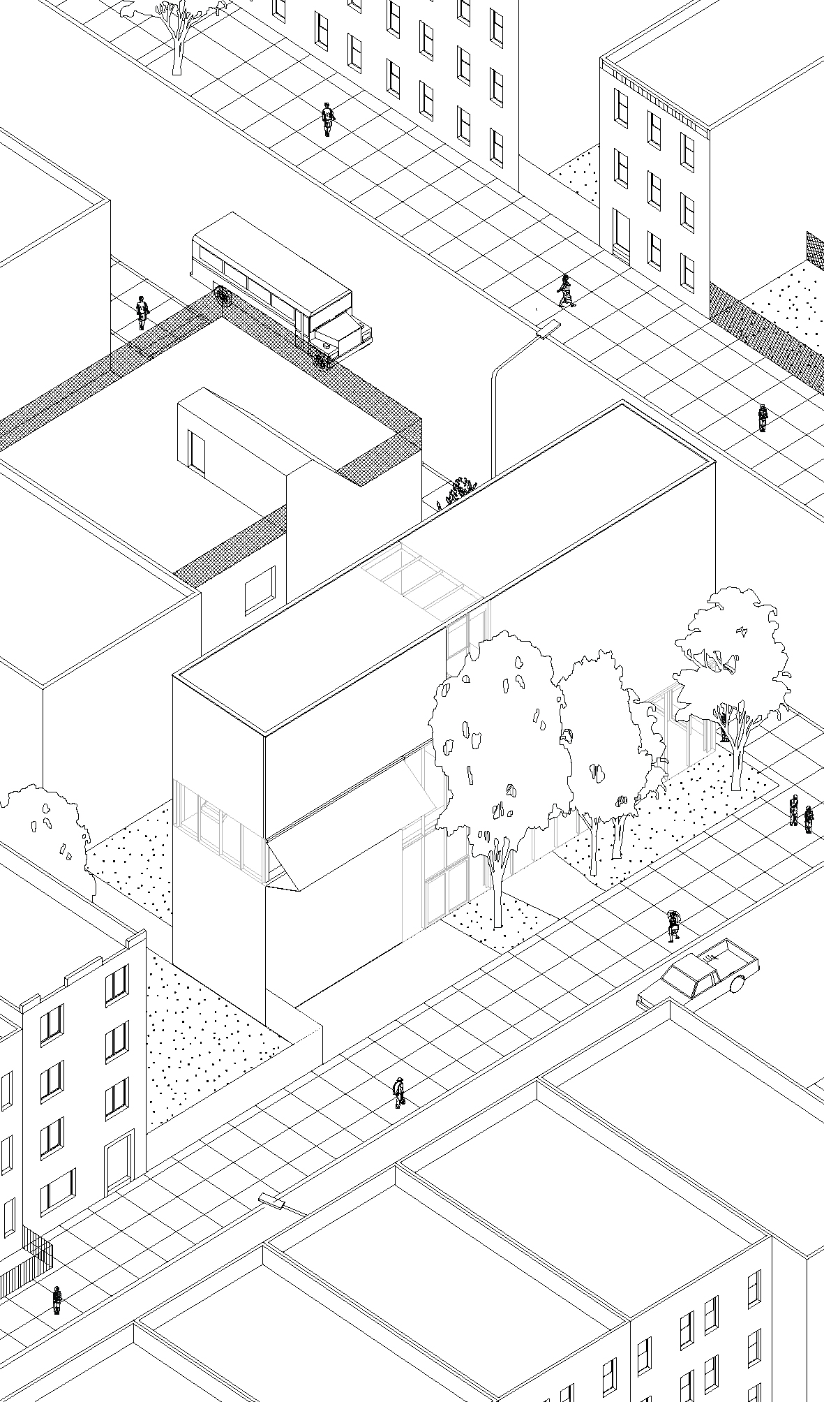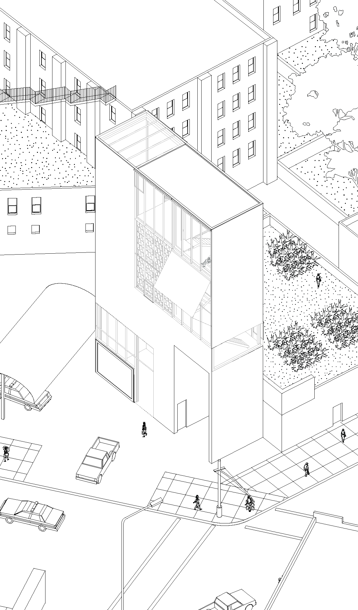 c: Corner of Hooper street has a rather large abandoned lot. Horizontal arcade of patios suggests shortcut, unbuilt space future development that has to take in account the surprising situation.